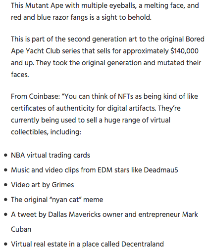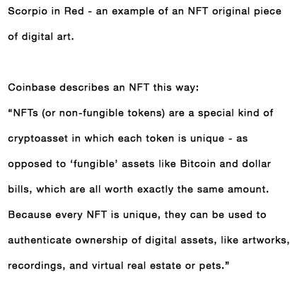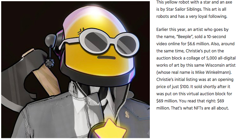 NFTs, or Non-Fungible Tokens, are a form of crypto currency and a form of digital art. If you Google it, it’s all the craze right now. An artist uploads an image online and sells it electronically. It gets assigned a transaction hash, which is like a blockchain; it’s one-of-a-kind …