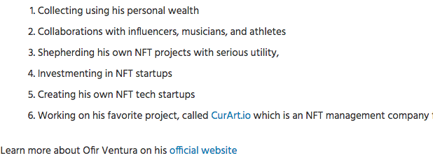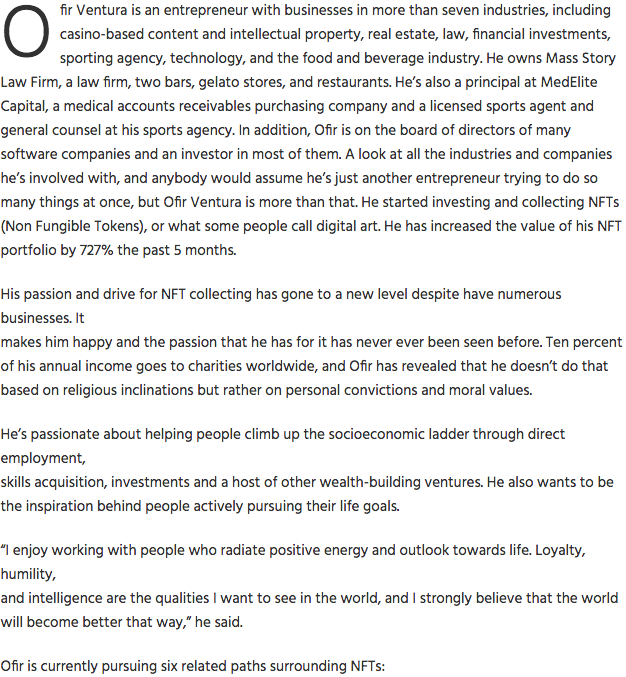 This is an unofficial site of Ofir Ventura’s, who is an expert in the field of NFTs, or Non-Fungible Tokens. NFTs are a form of crypto currency and a form of digital art. Please browse through this site to learn more about NFTs and to see some incredible examples of the art form as crypto currency.